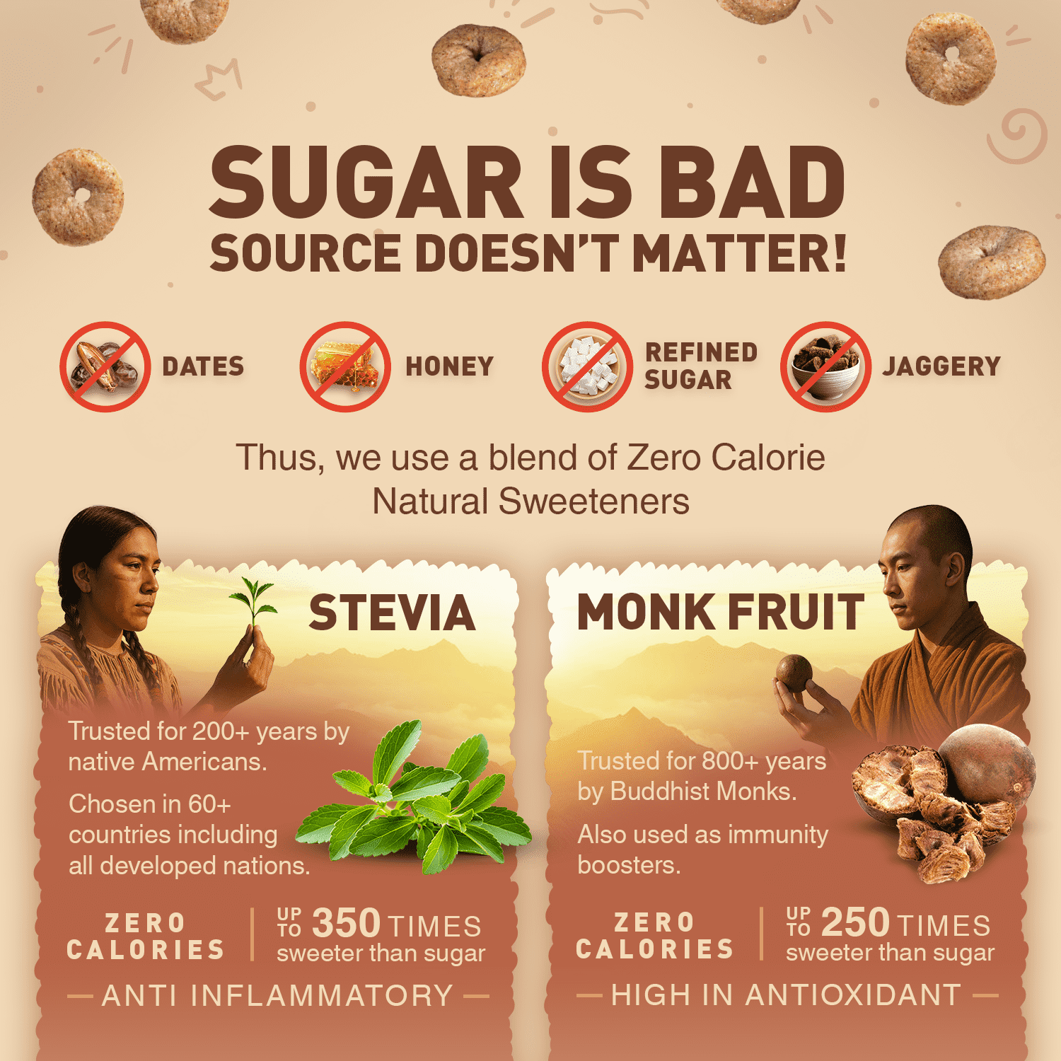 โ No Added Sugar in Any Form No refined sugar/dates/ honey/ jaggery; Sweetened with zero calorie natural Stevia & Monk Fruit