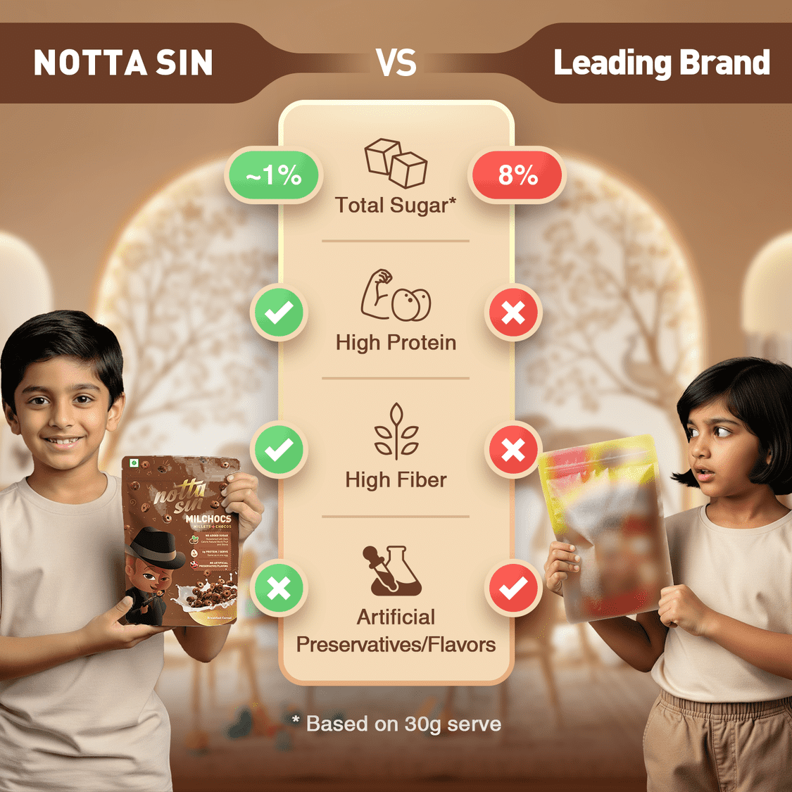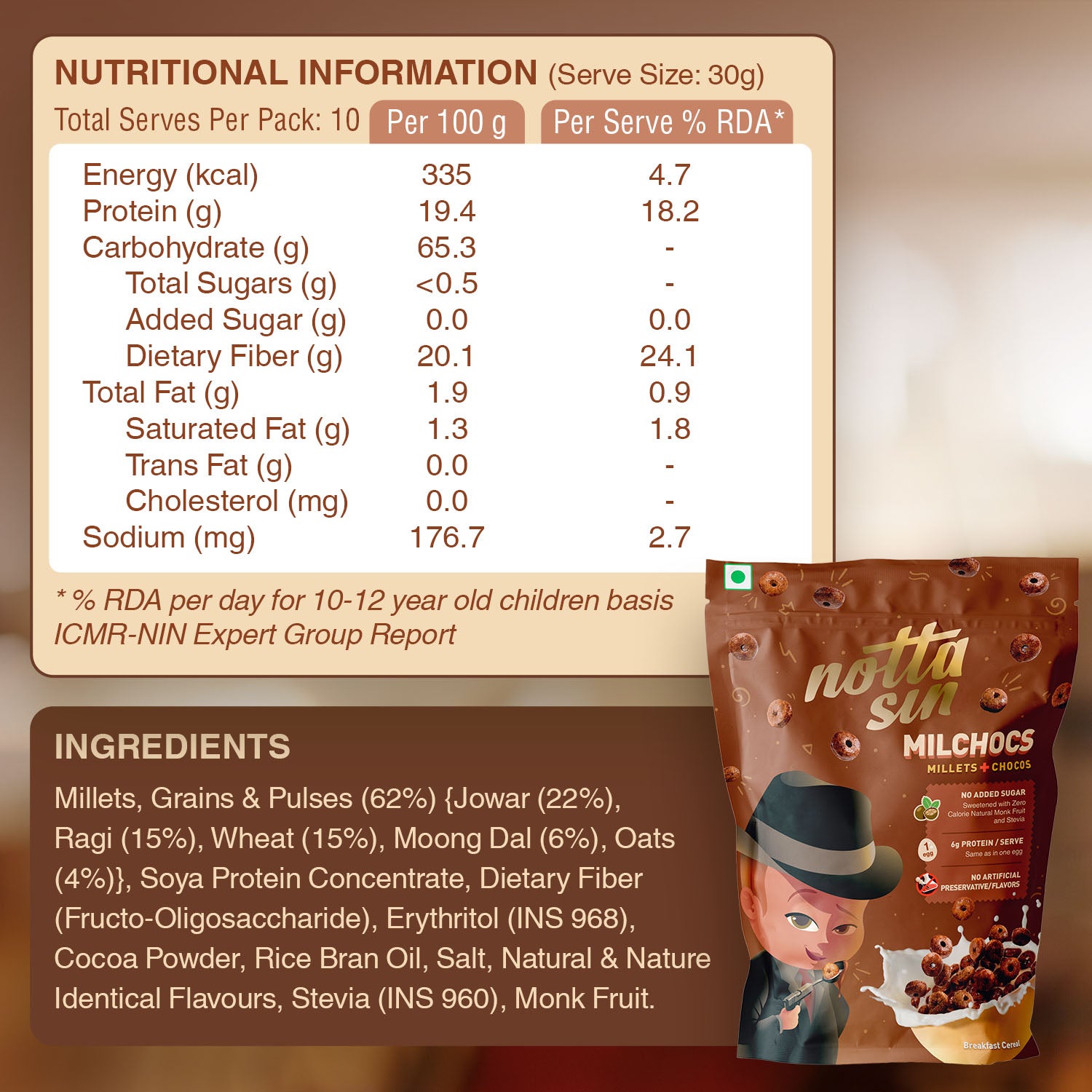 🍫 Chocolate Cereal with Millets & Grains – Rich cocoa meets the goodness of jowar, ragi, whole wheat, moong dal & oats.