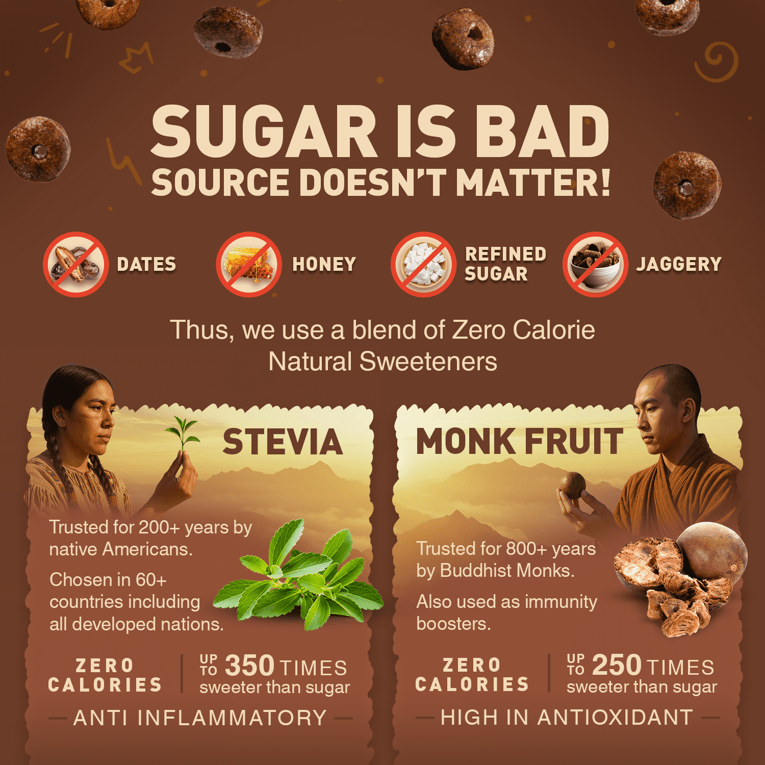 ✅ No Added Sugar in Any Form – No refined sugar/dates/ honey/ jaggery; Sweetened with zero calorie natural Stevia & Monk Fruit.