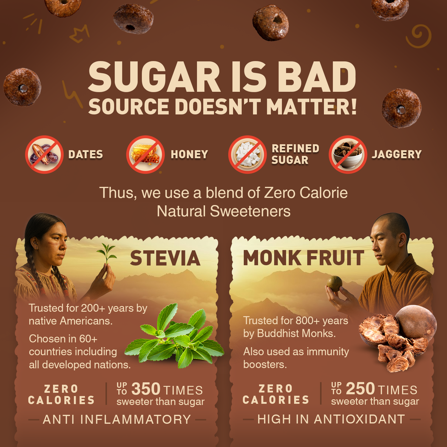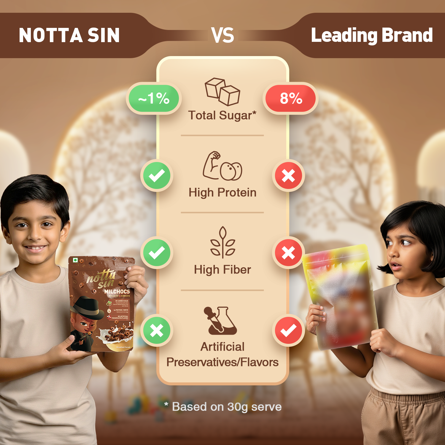 A chocolatey crunch kids love—with zero added sugar. Sweetened with Monk Fruit & Stevia, MilChocs is a fun, protein-rich cereal (6g per serving) made with millets like ragi. Perfect for breakfast or snack time, with no artificial ingredients.