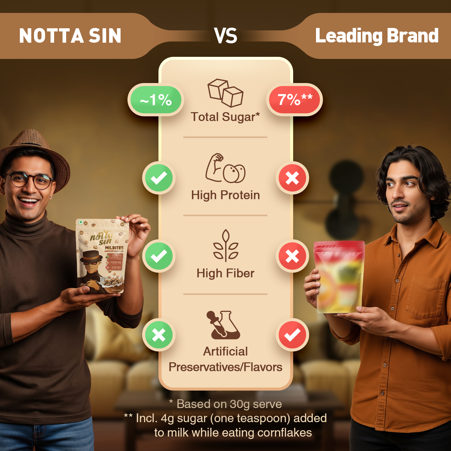A smart twist on cornflakes. MilBites combines jowar, ragi, moong dal, oats, and wheat for 6g protein and 6g fiber per serving. Naturally sweetened, clean-label, and satisfying—enjoy it with milk or straight from the pack.